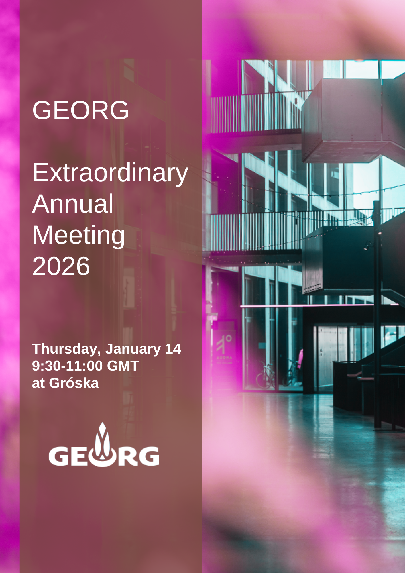 The board of GEORG – Geothermal Research Cluster, invites you to an extraordinary meeting of the association on Wednesday, January 14, 2026, at 09:30 – 11:00. The meeting will be held at Gróska, Bjargargata 1, 102 Reykjavík.